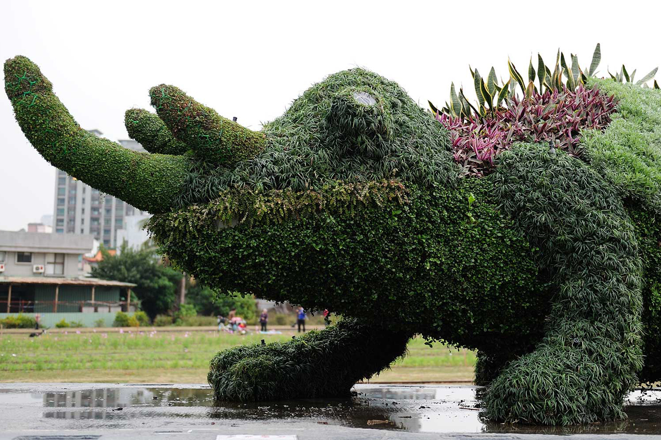 近期駁二鐵道區增加了兩個有趣的龐然大物,是結合綠色植栽的造型變色龍,多種綠色植物經過巧妙的搭配,就如活生生的大型變色蜥蜴攀爬於眼前,不過美麗的大型植栽需要大量的水分灌溉,故變色龍身內藏有噴灌系統無法裝設燈具於其中,那進入夜間後色彩繽紛的變色龍頓時黯然失色。