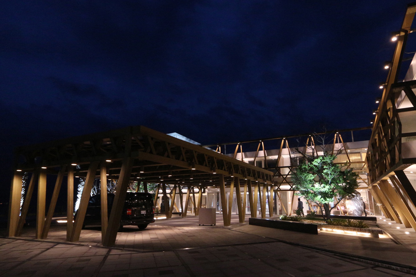 配合木造結構,採用暖白光為主要照明色溫,以光束強調木結構的幾何美感,並呈現出木紋溫暖質感。中庭兩種林木,以不同色溫表現分區,以及冷暖對比的趣味。個性的幾何線條造型景觀高燈及矮燈,呼應建築的視覺語彙。