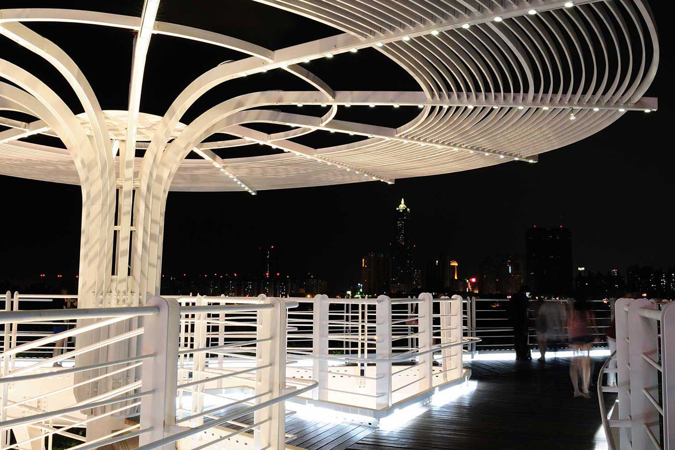 這座自行車橋以鋼構橋梁設計,蜿蜒流轉的車道宛如童話「傑克與碗豆」中的碗豆藤蔓一樣向外伸展, 夜間以兩種不同色溫來表達橋樑的美感, 冷白的高色溫為車道旁低尺度的照明光暈, 以光帶的方式安全地引導橋面上的行人或是自行車使用者, 有如行走於空中廊道般更加體會城市繽紛的夜景, 更可抬頭觀看南台灣美麗的星空。