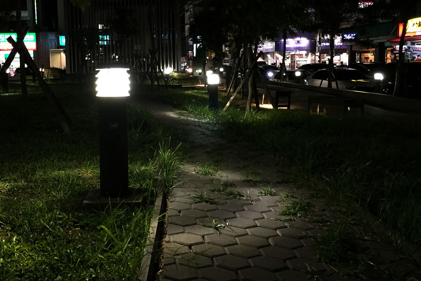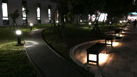 在人來人往的員林基督教醫院外,寧靜人行道上雄鷄照明的戶外景觀燈營造出公共空間緩和的就醫情緒,希望透過建築物外的景觀燈光設計讓就醫者稍加放鬆,減緩就醫時的不安感,綠色的景觀步道在夜晚的亮點中成為周遭民眾散步休憩場所,提升醫院夜晚景色的魅力與心靈療癒的效果。