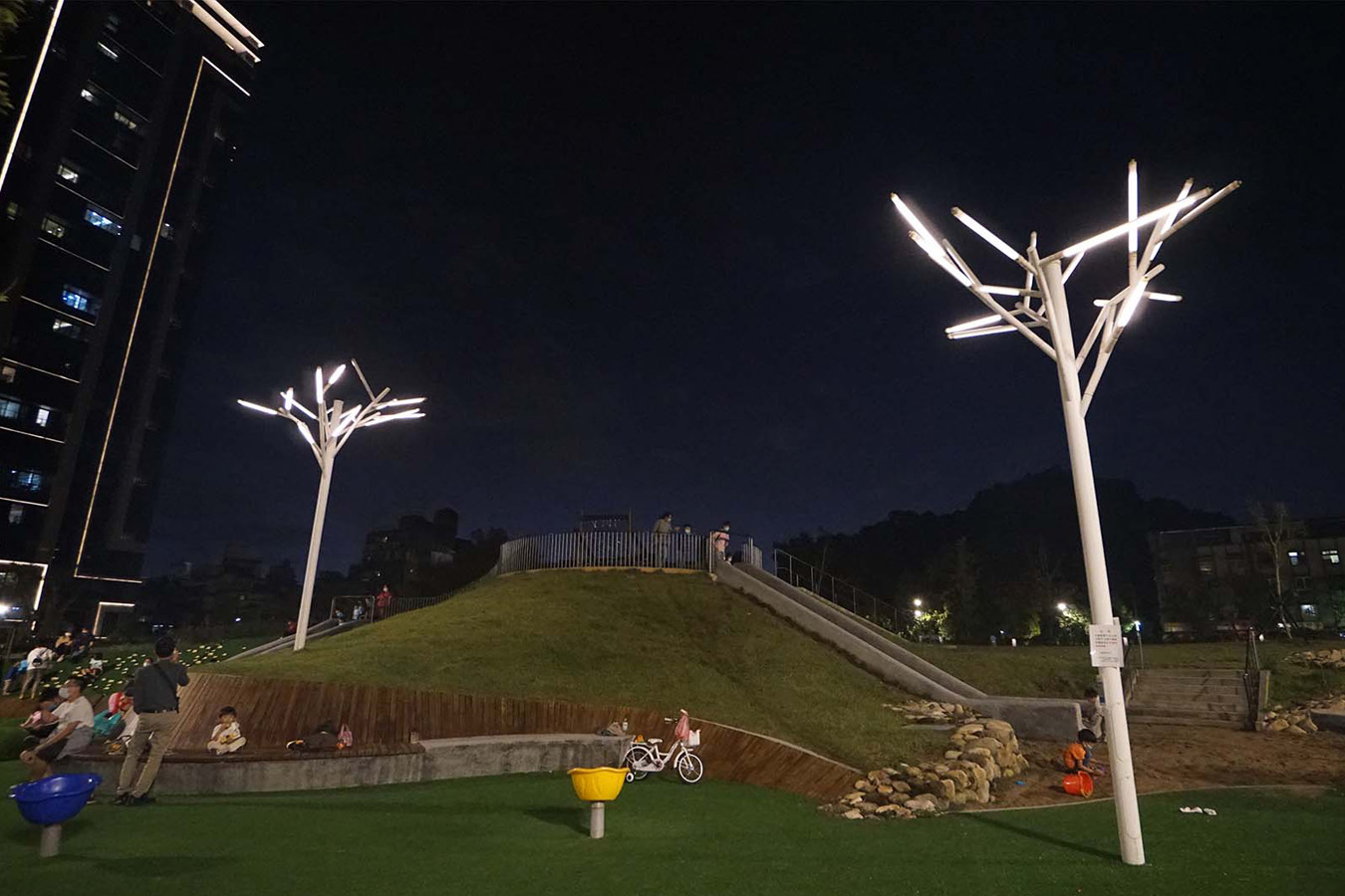 而在公園的中央區域更有二座客製化的樹木造型景觀燈隨著山林的呼吸產生不同的燈光明滅變化效果,讓公園成為台北市文山區別具特色的生態友善休憩遊樂場所。