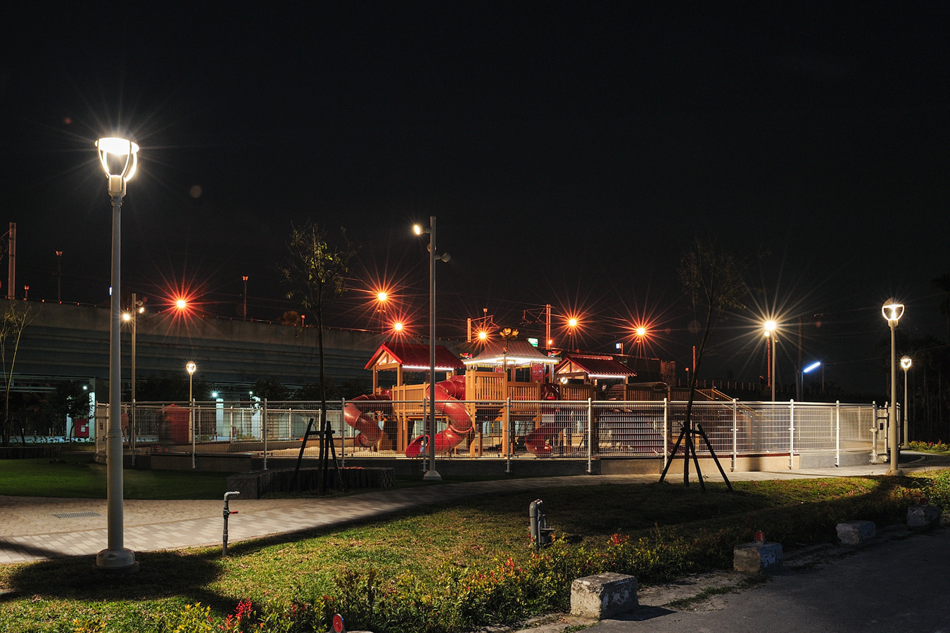 屏東地處熱帶地區,白天氣溫過高,大部分家長傾向於傍晚後才帶小朋友出來散步遊玩,夜間公園內步道的高燈照明可以提高整體環境安全,而投光型高燈的設置非但能強化遊戲區域的照明,更可凸顯客家特色王爺奶奶所乘花轎主題遊具的特色造型。