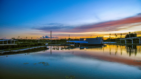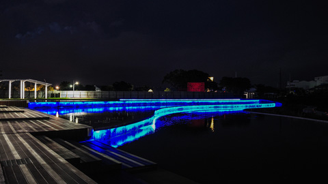 地景劇場則透過藍光線性燈的設置將區內高低落差層疊的鏡面水池營造出沉靜又不失魅力的燈光藍帶造景,而在鄰水步道沿途兩側安裝著獲2020台灣精品獎肯定的G06太陽能地磚燈,琥珀光點非但能供行人引導照明,更與一旁的藍光水帶相互輝映。