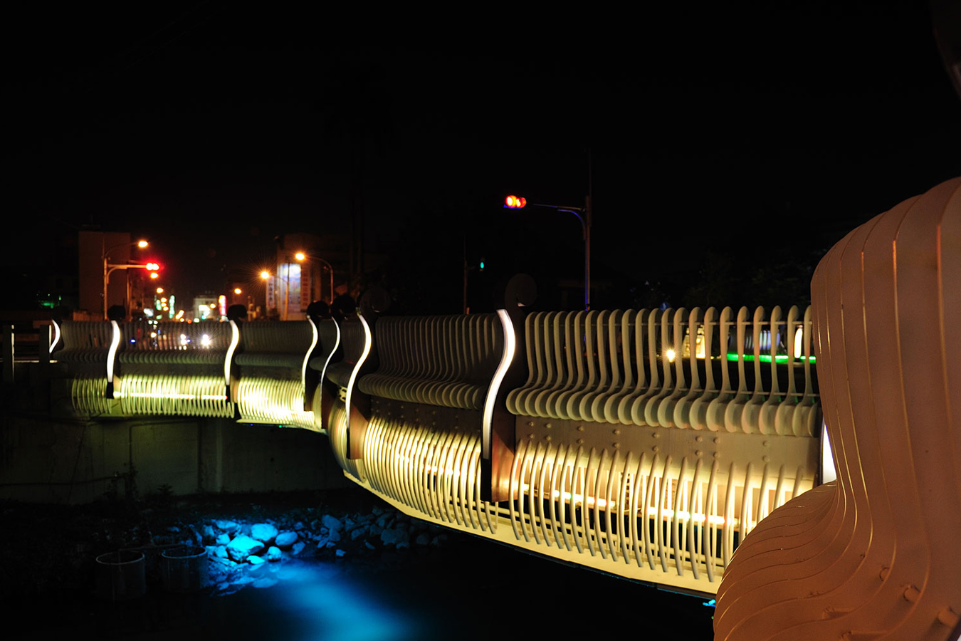 造型獨特的屏東萬福橋,是屏東地方政府對於當地社區的回饋,希望藉由橋體修建拓寬,更能夠帶來交通上更多的便利性。 雄鷄照明接獲工程單位對於燈光的需求,身為屏東在地的廠商當仁不讓,將橋體如小提琴優美的造型橋上,裝設上全彩的燈具及控制系統,打造屏東首座彩虹光雕橋。