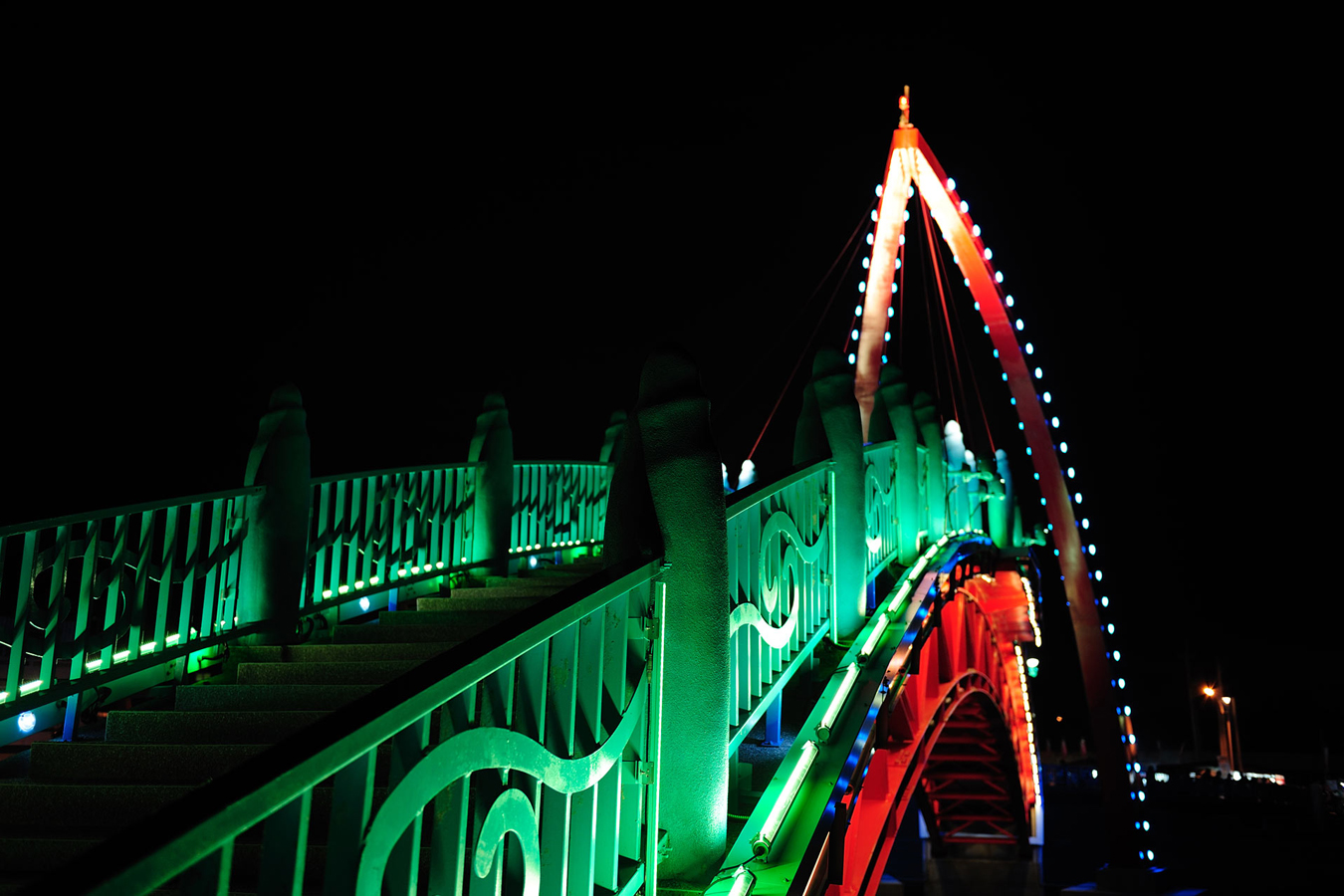 雄鷄照明打破紅色造型橋拱無法投光變色的侷限,以全彩光點勾勒出不同神采,整體燈光搭配DMX智慧型數位展演定時控制器,除了營造流光燦影的魅力氛圍,同時設定節能時段,於夜深人靜時將港灣回歸夜晚的靜謐。