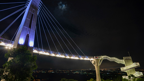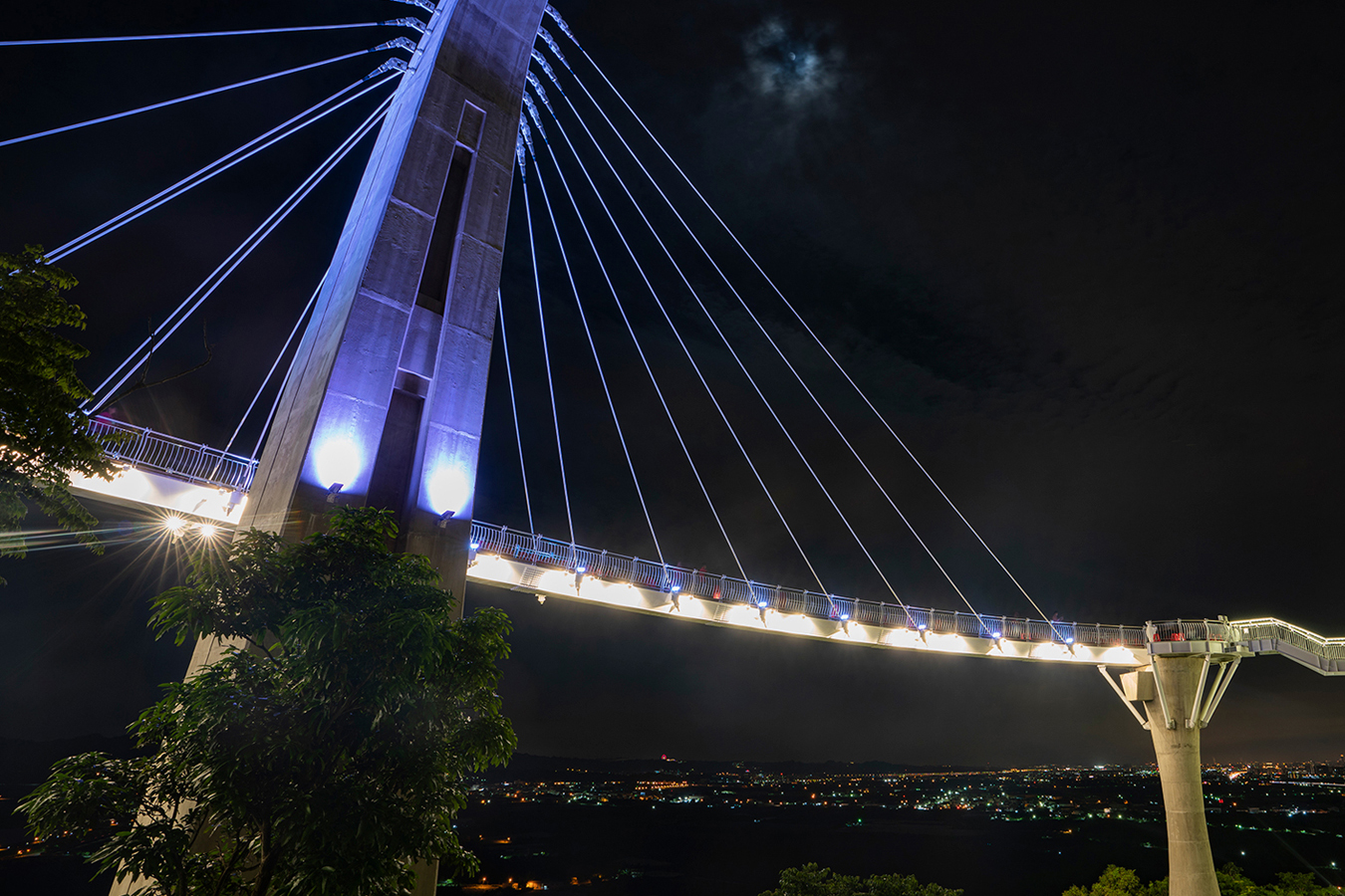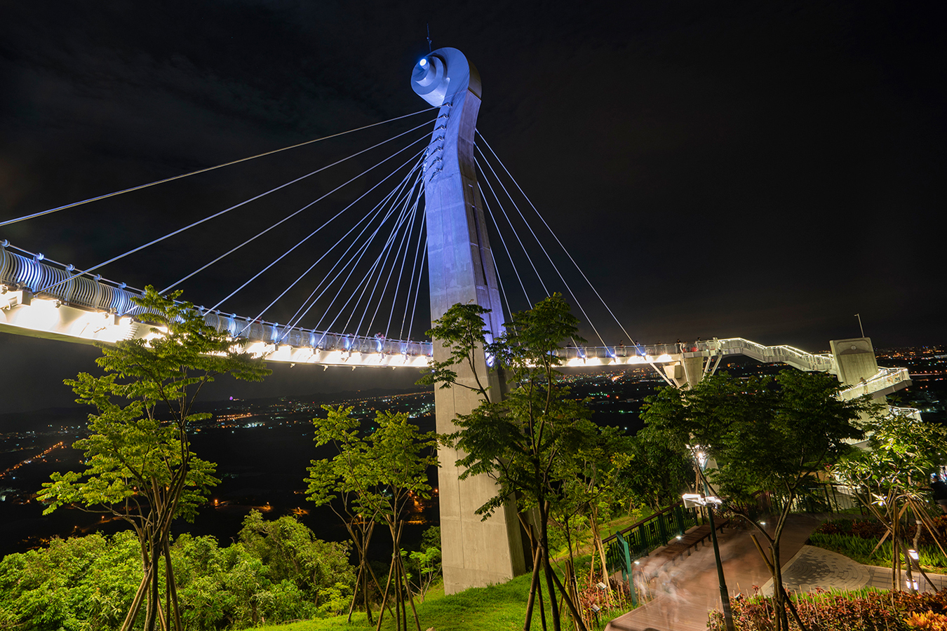 進入廊道像進了另一個浪漫世界,一眼望去提琴造型的主塔橋及琴弦意象的鋼索在RGB LED投光燈的投射下展現出不同於白天的華麗面貌,燈光的彩色變幻加上光影的明暗對比,印入眼簾的是燈光的幻影魅力,而在固定時段為整座廊道主結構精心設計的燈光主秀,更是精彩絕倫,時而緩慢時而急促的燈效變化,時而優雅時而絢麗的燈光展演,讓人漫步於雲端不僅享受到視覺饗宴,更感受到聽覺的盛宴 !