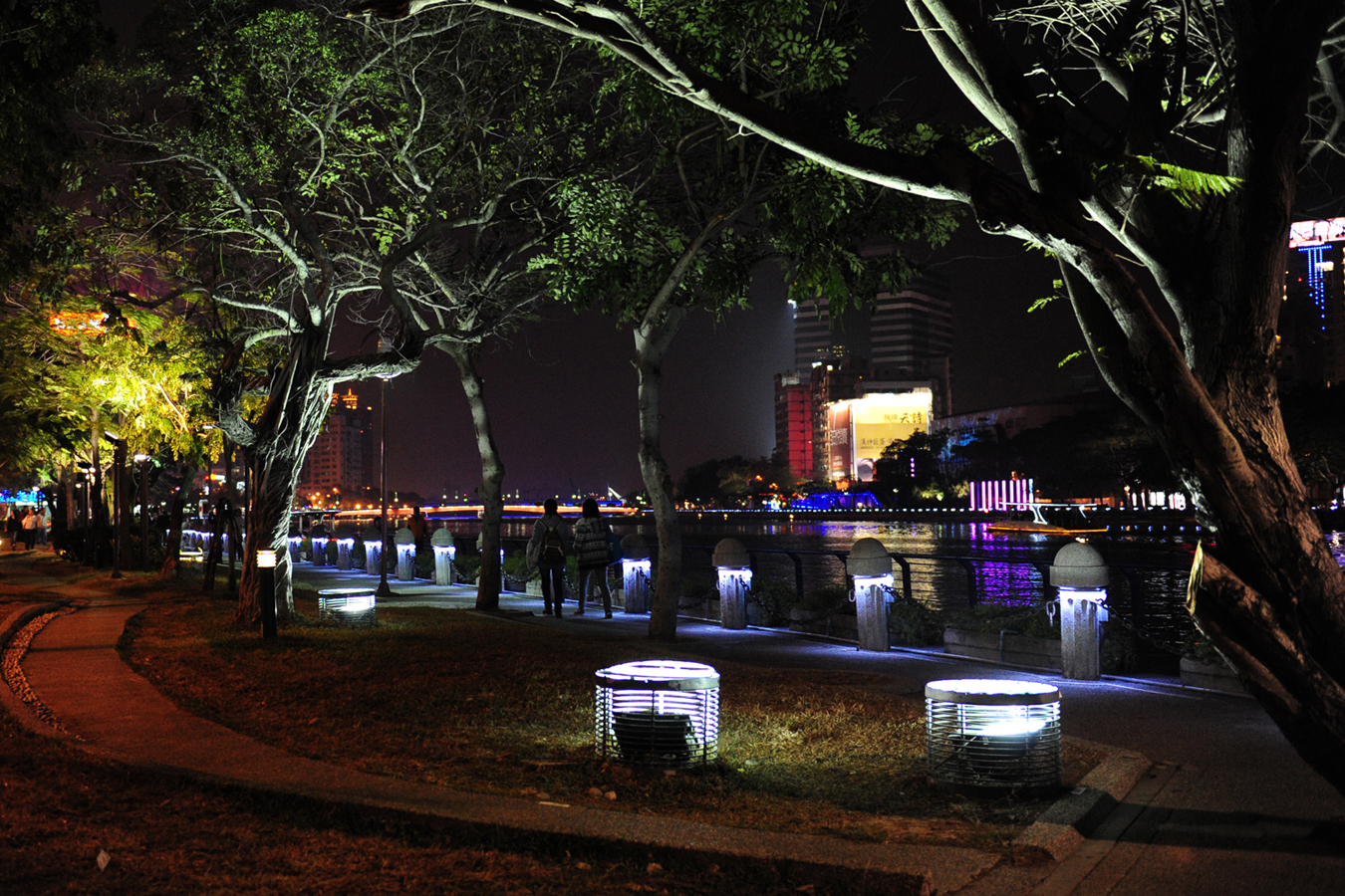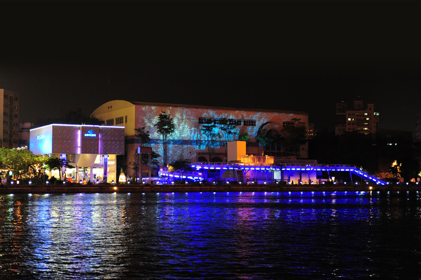 每當夜幕低垂時分,愛河變身為浪漫的魔法師,首先由跨越愛河兩岸的橋樑展開光的序曲,隨著水色光影交錯之中,雄鷄提供的「水波紋效果燈」,將這份光幻流影來投映在鹽埕國中的游泳池上的白色牆面,那動態的流水光影令人有置身河水漫遊的錯覺;兩岸的綠鬱的樹叢則用投上暖黃光色,海風輕弗搖曳帶動著樹與影交錯;最後沿岸原本靜默的石砌護欄,雄鷄則提供LED模組及光點燈,成功轉幻為美麗的水岸珠璉,串連起愛河那藍色公路中耀眼的白寶石......。