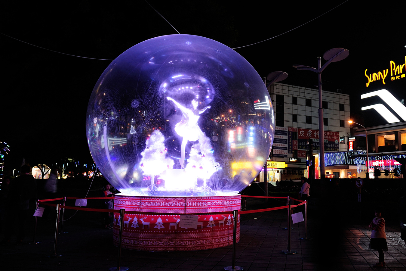 在迎賓椰林大道前一眼就能看到今年的聖誕主燈「浪漫水晶球」,超大型的水晶球裝置內芭蕾舞女孩隨白雪紛落的場景旋轉起舞,RGB光彩變幻的展演燈效搭配應景的節慶音樂,讓每一位遊客沉浸於無限想像,再次重回孩童時的浪漫憧憬;漫步在「歐風耶誕橫幅燈景」的椰林大道中,觀賞者頓時感受到濃厚的歐洲耶誕節慶氛圍;懸浮於湖面上的「鏡水月」以鏡面作為幾何多面體的皮層,透過LED動態燈光與鏡面體的反射於水面產生多層次的光影變化;在靠近仁愛路側的「生命樹」,概念來自於北歐神話中的世界之樹,枝幹末端不同光色的果實象徵不同的種族與生命,運用空間以及燈飾設計營造四海昇平、共生共榮之感。