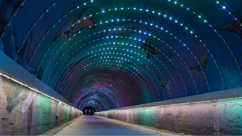 雄鷄照明團隊精心設計10種不同的主題光影動畫打造奇幻沈浸式體驗。海底極光勾勒出充滿無邊幽暗的海底世界;旗津趣展現出旗津海天一色,在美麗的夕陽下看著大船入港;螢火蟲世界刻意營造小小螢火蟲穿梭於隧道之中,如穿越時空隧道來到童年時光;程式碼更讓人置身於探索科技與未來感十足的網絡空間。另外還有旗津印象、藍色多瑙河、雷神降臨、穿梭、聖誕節、歡樂煙火等不同的主題光影動畫,讓旅客漫步在全新繽紛光廊中,在絢麗的特效中感受浪漫氛圍。