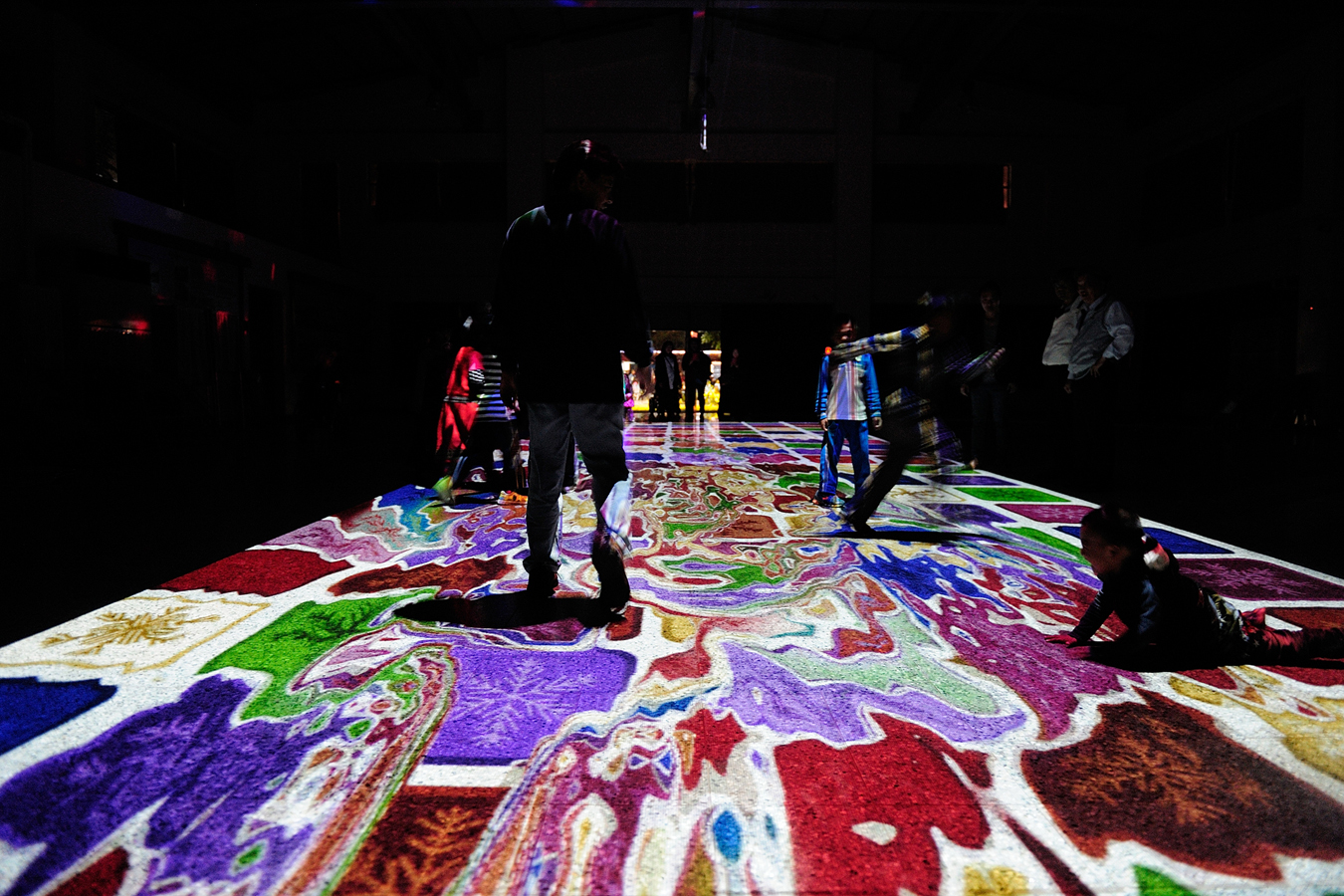 雄鷄照明除了最擅長的貨櫃投影外,這次利用部落活動中心的大面積地板規劃大型投影光雕搭配互動模式,按照民眾不同的位置由感應器轉換成數位訊號,再傳送至電腦,造成民眾所在的位置畫面有不同的變化,讓參與的民眾大呼驚奇,也因此讓投影光雕有了更不一樣的展演方式。另外在活動中心門口我們利用不同紋路的效果片搭配不同燈色將人行步道投射出不同顏色的水波紋,讓人行道變得像水面一樣,使民眾在進入活動中心前感受到燈光奇幻的魅力。
