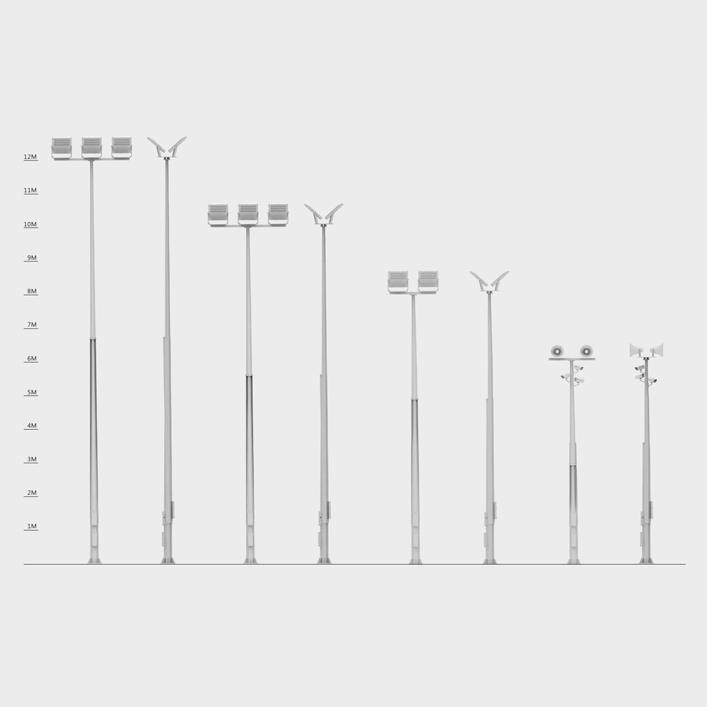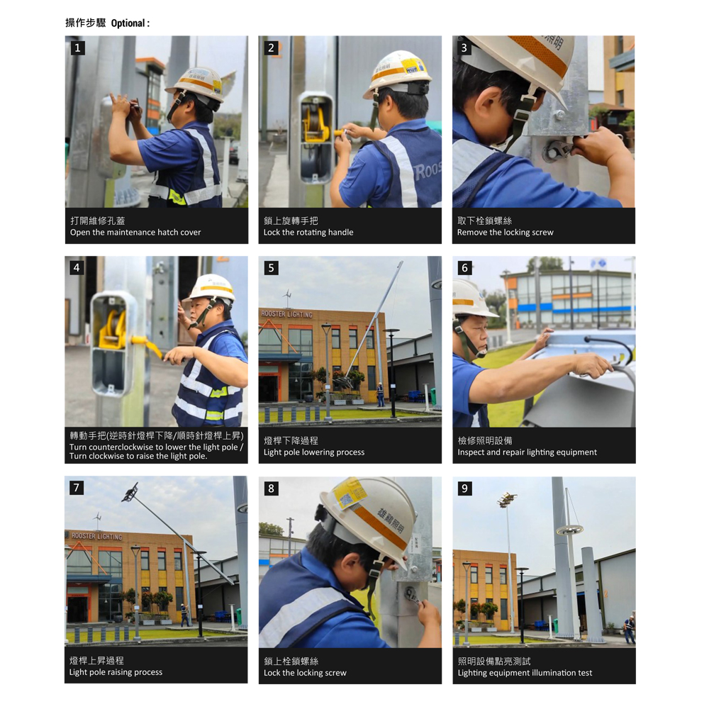 本易力桿可於地面安全完成照明設備的安裝與檢修,無需額外高空作業設備,特別適用於燈具安裝高度在12公尺以下的場合。非常適合用於戶外球場、運動場、活動廣場等需設置高功率投光燈的區域。